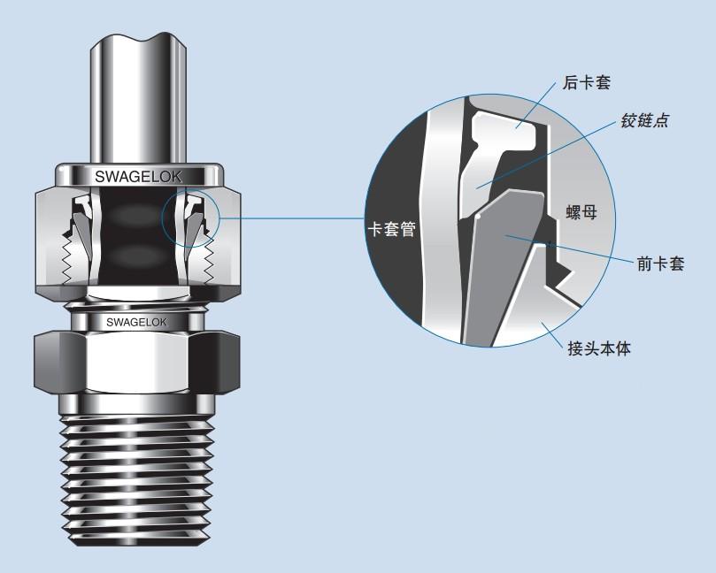 这是 1/4  至 1/  in.  和 6  至 1 mm 世伟洛克不锈钢卡套管接头的标准设计,其目的是帮助安装人员完成更加坚固的防泄漏卡套管连接。在这些尺寸中,一种获得专利的表面硬化工艺以及获得专利的凹槽和特定断面几何形状为世伟洛克后卡套提供了独一无二的工程学特点。具有铰链-夹箍作用的后卡套设计不仅进一步增强了传统卡套设计所具有的坚固性能,而且还提供了: